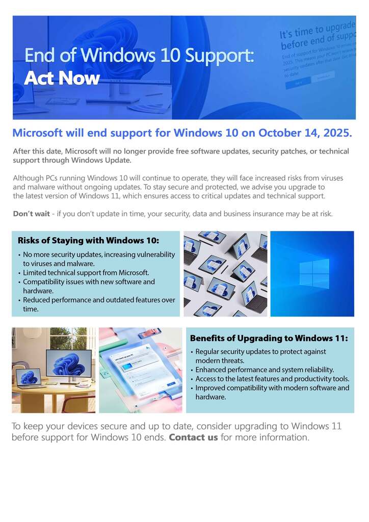 Support for Windows 10 is coming to an end on 14th October 2025; this means you’ll no longer receive support and security updates from Microsoft, leaving your machine open to attack from malicious software and hackers. You can find out more in the Infographic below: