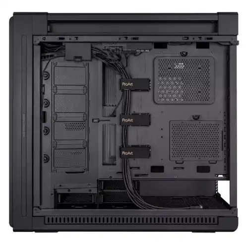 ProArt PA602 E-ATX computer case, 420 mm radiator support, one 140 mm and two 200mm pre-installed system fans, front panel IR dust indicator, power lock latch, tool-less PCIe mounting, USB 20Gbps support