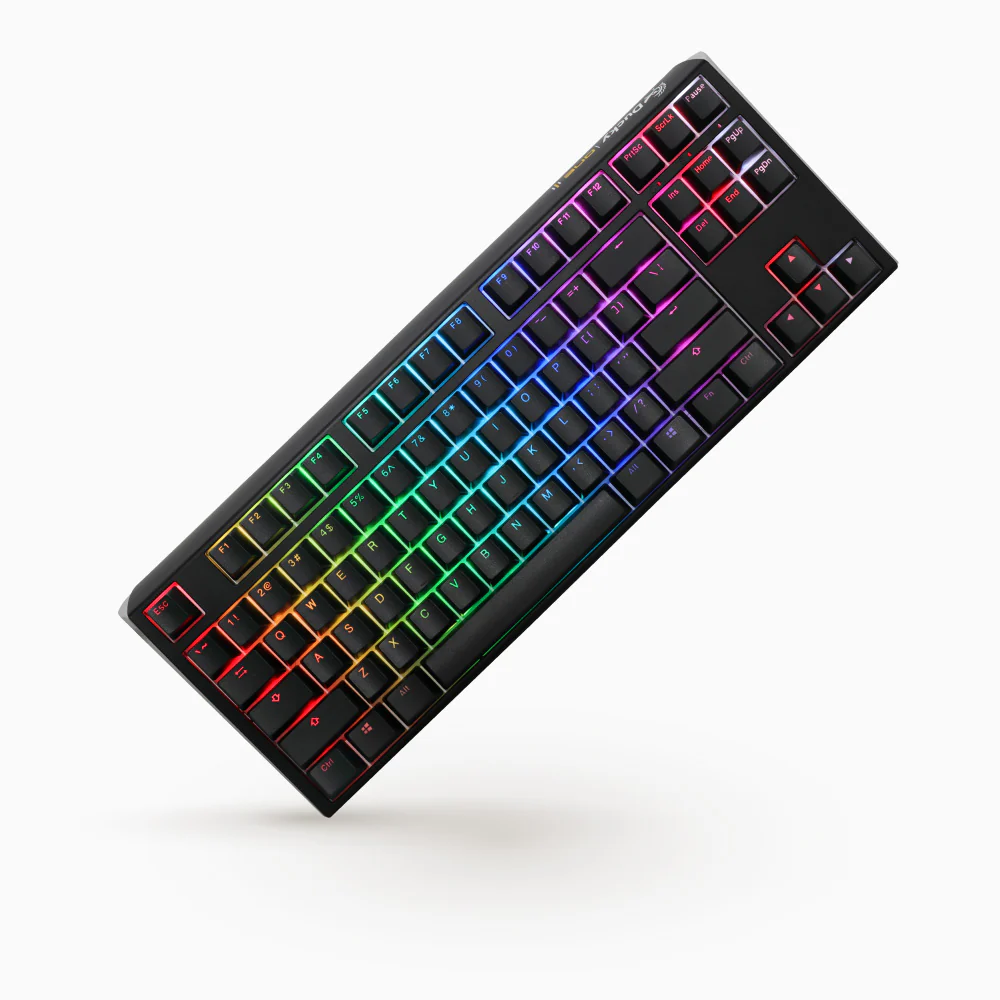 TKL (80%) mechanical gaming keyboard, Quack Mechanics, Genuine Cherry MX switches, Per-key RGB lighting, Detachable USB-C cable, UK ISO