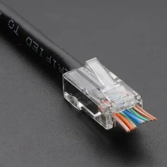 This innovative RJ45 8P8C connector simplifies twisted pair terminations by allowing the wires to be inserted through the connector completely and out the front. This allows users to easily verify the proper wiring order. Because this also allows to tightly pull the connector down over the cable jacket it seats more tightly in the rear of the connector as well. This reduces the distance between the wire twists and contacts and improves performance.